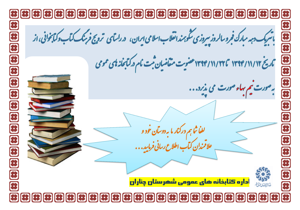 به گزارش روابط عمومی نهاد کتابخانههای عمومی کشور، معاونت توسعه کتابخانهها و کتابخوانی نهاد کتابخانههای عمومی کشور در نخستین بخشنامه با اشاره به در پیش بودن ایامالله دهه مبارک فجر آورده است: «نظر به در پیش بودن ایام الله دهه مبارک فجر و سالروز پیروزی شکوهمند انقلاب اسلامی ایران، در راستای ترویج فرهنگ کتاب و کتابخوانی از تاریخ 12/11/1394 تا 22/11/1394 عضویت متقاضیان ثبت نام در کتابخانههای عمومی به صورت نیم بهاء می باشد»