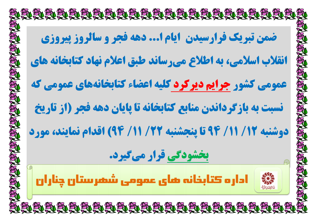 معاونت توسعه کتابخانهها و کتابخوانی نهاد همچنین در بخشنامهای دیگر با اشاره به جرایم دیرکرد کلیه اعضای کتابخانههای عمومی کشور خاطرنشان کرده است: »جرایم دیرکرد کلیه اعضای کتابخانههای عمومی که نسبت به بازگرداندن منابع کتابخانه تا پایان دهه فجر (از تاریخ دوشنبه 12/ 11/ 94 تا پنجشنبه 22/ 11/ 94) اقدام کنند، مورد بخشودگی قرار میگیرد.»